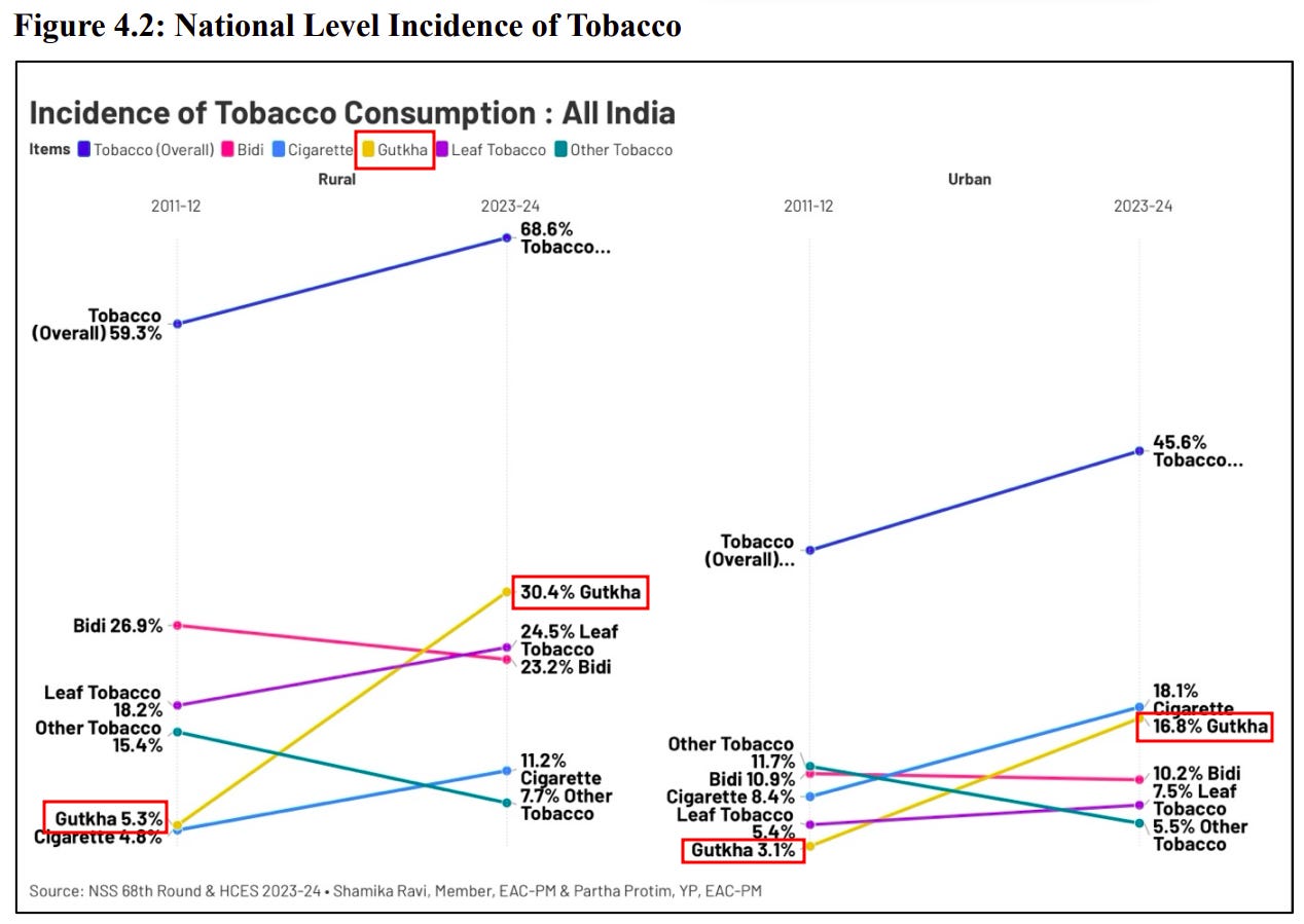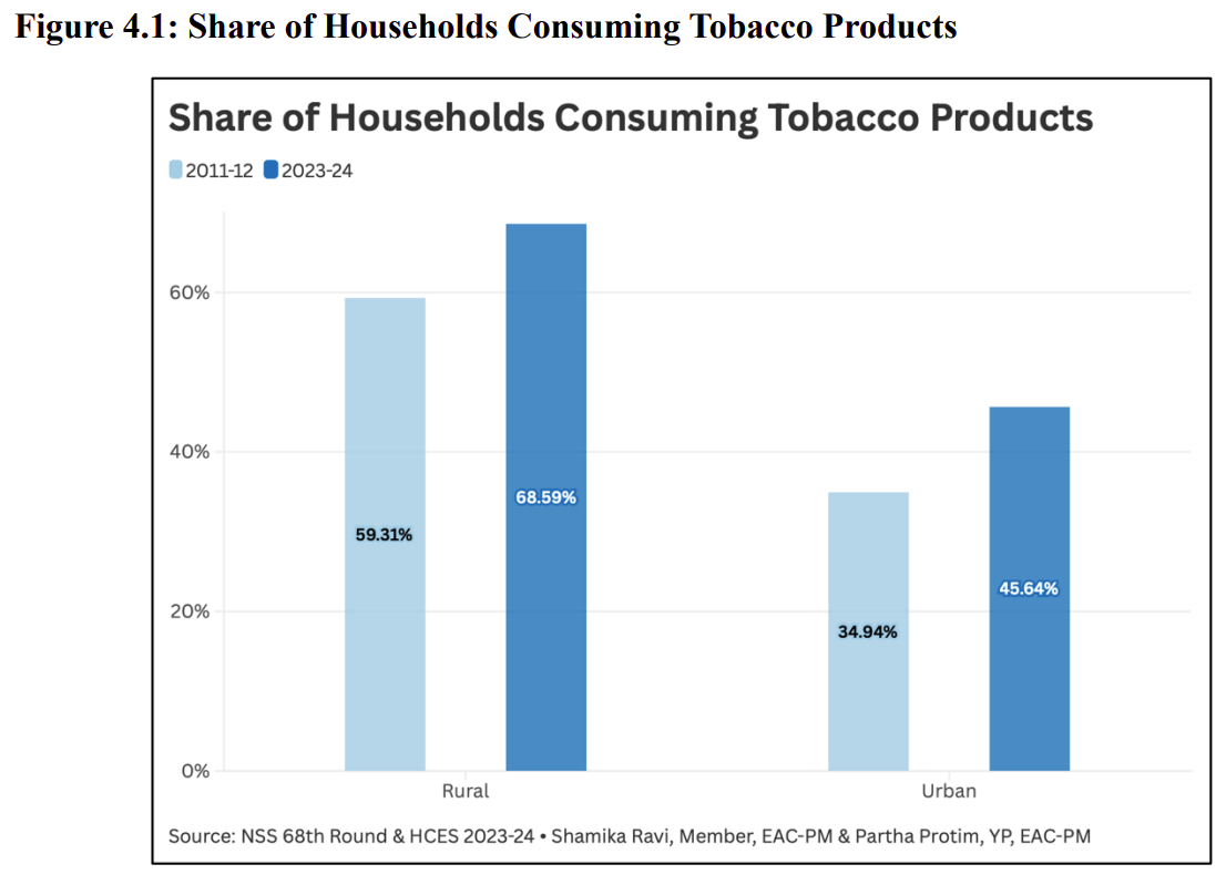 Then came the Household Consumption Expenditure Survey (HCES) 2023-24 — the government’s massive exercise in tracking what Indian households actually spend money on — and the picture it painted was radically different. A working paper by the Economic Advisory Council to the Prime Minister (EAC-PM) used this data to argue that tobacco isn’t declining at all. If anything, the opposite is true.