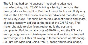 Let’s start with the semiconductor industry, which has a huge global supply chain. The US has been attempting to get back a lot of semiconductor manufacturing to its base, primarily to reduce reliance on Taiwan. To that end, it invited TSMC to build a massive plant in Arizona. However, the plant has struggled with delays, cost overruns, and shortages of specialized workers that Taiwan doesn’t really lack.