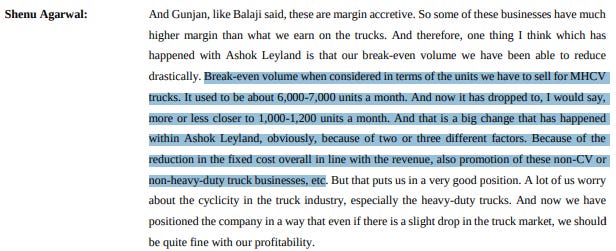 Most strikingly, Ashok Leyland has become much more operationally efficient. Compared to 6,000-7,000 units monthly a few years ago, it now just takes them 1,000-1,200 units a month to break even. This improvement is driven by a meaningful reduction in fixed costs across the organisation, and a growing contribution from higher-margin, non-truck businesses — such as defence, power solutions, and LCVs.