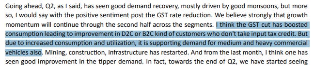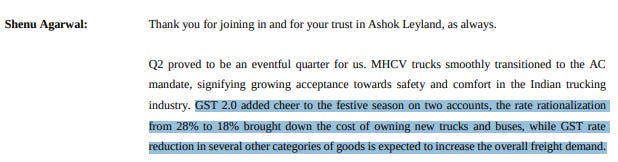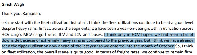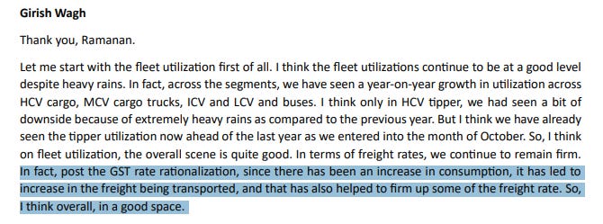 However, where GST was a tailwind for them, some sectors were not — the tipper trucks used in construction and mining had a rough Q2. The reason is simple: these sites shut down or slowed significantly due to heavy monsoons. By October, utilisation had already bounced back above last year’s levels.