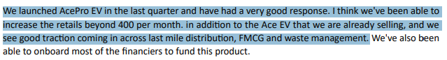 Last quarter, TMCV launched the Ace Pro EV, which is primarily meant for last-mile delivery as well as FMCG distribution and waste management. And it has caught some good traction early on — since the launch, 1,300 units have already been delivered. TMCV has also built out the supporting charging infrastructure, with ~25,000 public chargers across 150 cities for its small commercial vehicles.