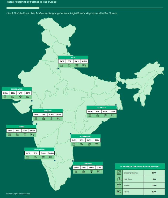 In the big metros, Knight Frank counts about 105 million square feet of formal retail space, and almost all of it — 98 million square feet — sits inside malls. The rest is scattered across the big high streets, airports and five-star hotels.