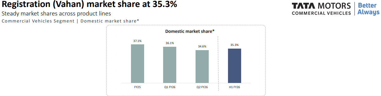 Tata Motors has dominated the CV market for decades. While in recent years, competitors have chipped away at its lead, it remains the industry leader with a ~35% market share. Recently, Tata Motors demerged its passenger vehicles (PVs) and its CV business — which is now listed separately as Tata Motors Commercial Vehicles (TMCV).