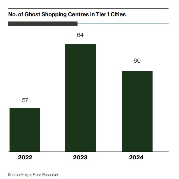 Knight Frank’s report shows that the ghost mall trend is not slowing down. Tier-1 cities had 57 ghost malls in 2022, 64 in 2023, and 60 in 2024.