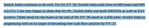 Now, Ashok Leyland makes its EVs under a brand called Switch India, and so far, it has had a very strong year. The brand delivered close to 600 electric buses and 600 e-LCVs in the first half of the year alone. Impressively, the business, while still fairly small, has already achieved a positive PAT in that period. They have a strong order book that stood at 1,650 buses by the end of H1 FY26, and the company targets free cash flow positivity by FY27.