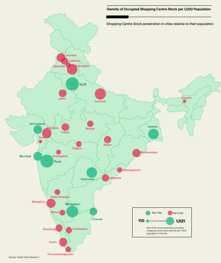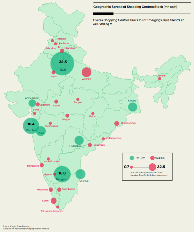 Knight Frank looks at where India actually shops and builds a full map of it. They pick 32 cities and count every big piece of organised retail in them. They found 365 working malls with over 22,400 stores. But this map also includes 58 high streets.