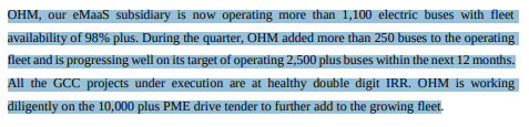 OHM has over 1,100 such electric buses, with an impressive fleet availability of more than 98%. It added 250 buses in Q2, and is targeting 2,500+ buses over the next 12 months. They find this a lucrative business — partly due to the aid of government policy — and continue to invest more resources in it.