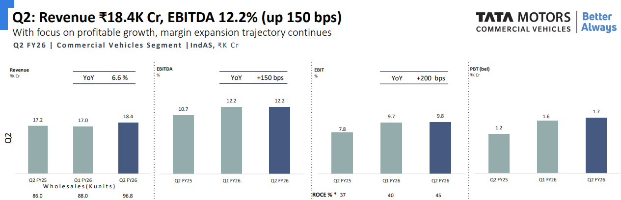This quarter, TMCV posted revenue of ₹18,370 crore — a 6.6% increase from last year. The EBITDA margins came in at 12.2% — an improvement of 1.5 percentage points from last year. CV companies typically operate in the 10-14% EBITDA margin range during healthy periods.