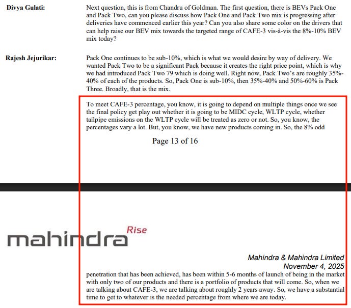 Mahindra’s logic also runs counter to Maruti’s, but for a different reason. Most of Mahindra’s volume today comes from large SUVs — Scorpio, XUV700, Thar — which naturally carry higher CO₂ numbers. On the surface, you’d think CAFE-3 would be hard for them. But Mahindra is in the middle of shifting its portfolio. On their concall, Rajesh Jejurikar, the CEO, spoke about EV momentum. He pointed out that Mahindra’s current EV penetration — around eight percent — has come within just five to six months of launching only two EV models, and that a much larger set of EVs is coming over the next couple of years. And because CAFE-3 only kicks in around FY28, they believe they have more than enough time for their EV ramp-up to bring their fleet average safely within the limit.