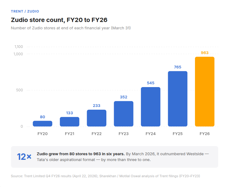 Trent, the Tata Group’s retail arm, published its full-year results last week. By March 31, 2026, it was running 963 Zudio stores across India. Zudio, if you haven’t been, sells T-shirts for ₹399, jeans for under ₹600 with 47 new cities entered in the last quarter alone and 80% of new stores in Tier II and Tier III cities.