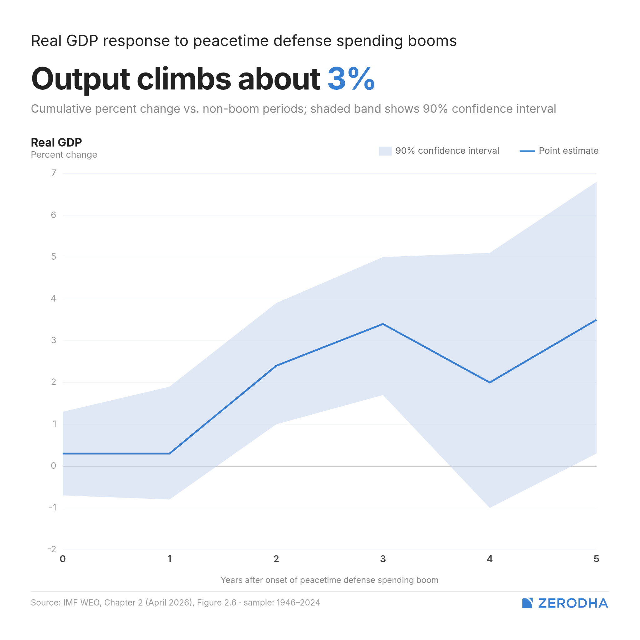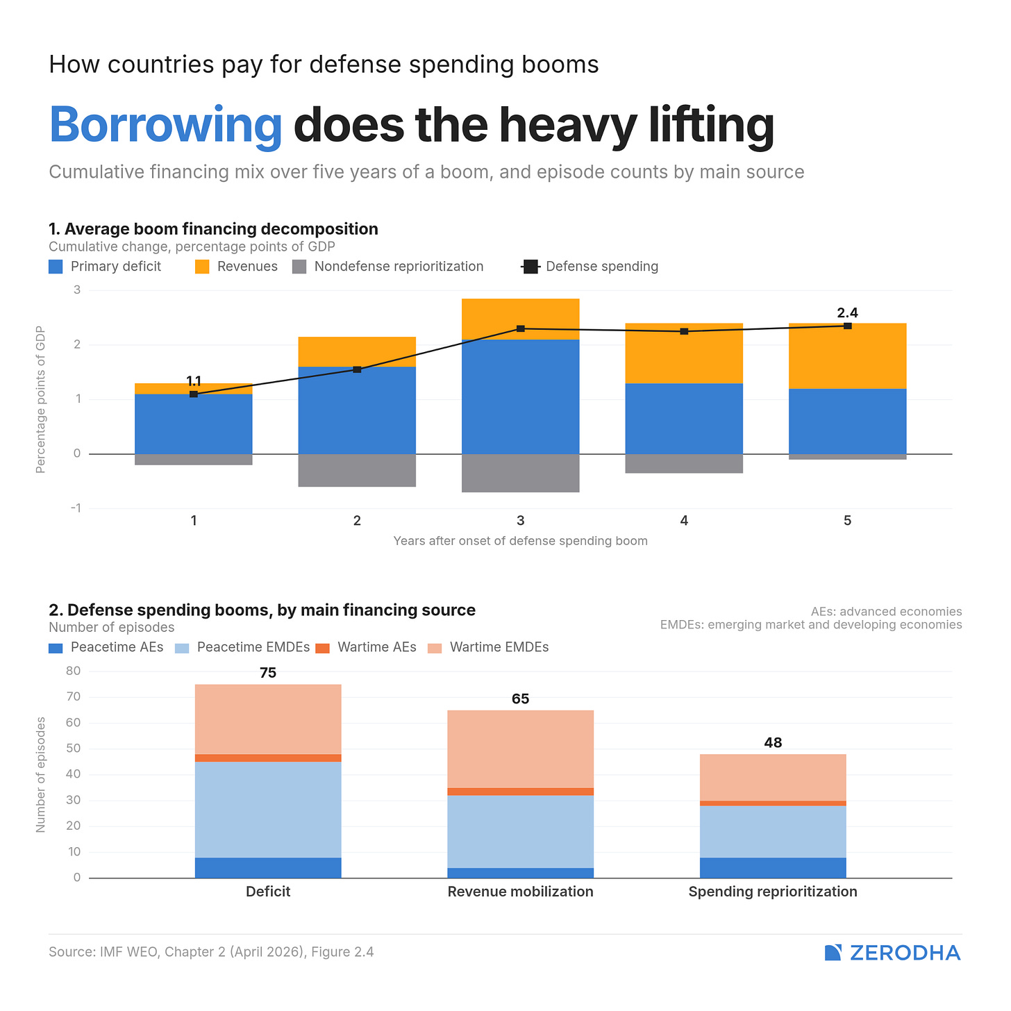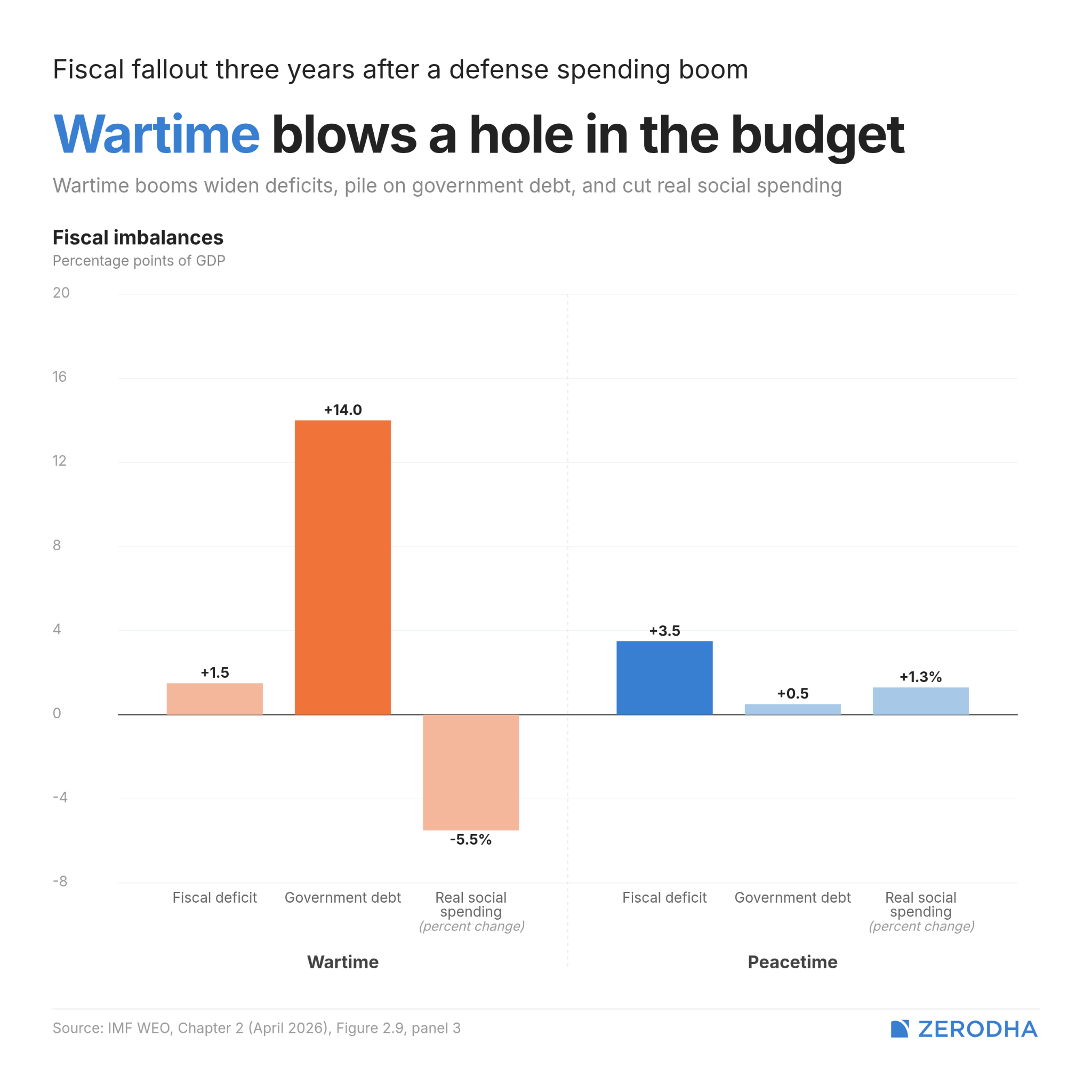 Two of the three chapters in this year’s WEO are entirely about the military turn in global politics. Chapter 2 studies what rearming costs an economy, and Chapter 3 studies what actual war costs. Together, they form something like an escalating argument — spending, fighting, recovering — with each stage more economically damaging and harder to reverse than the one before.