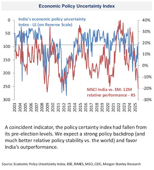 At the same time, India’s policy stability stands out against its peers. On their index, India has among the lowest “policy uncertainty” scores, supporting its long-term case even if short-term flows remain volatile.