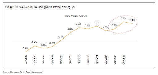 FMCG companies like HUL and Dabur, which saw weak rural demand in FY22–23, are reporting some recovery as consumers move back to larger packs. Rural housing construction is also showing signs of life, helped by easing input costs.