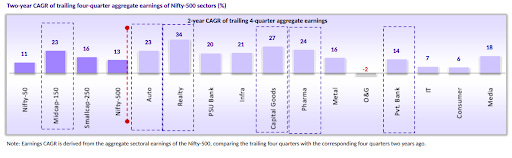 Earnings, however, tell a different story. Midcaps have delivered stronger earnings growth than prices suggest, led by real estate, capital goods, pharma, and private banks.