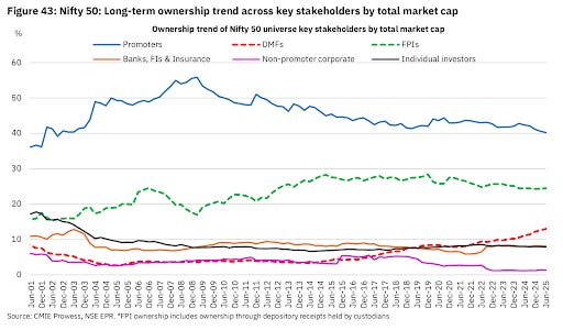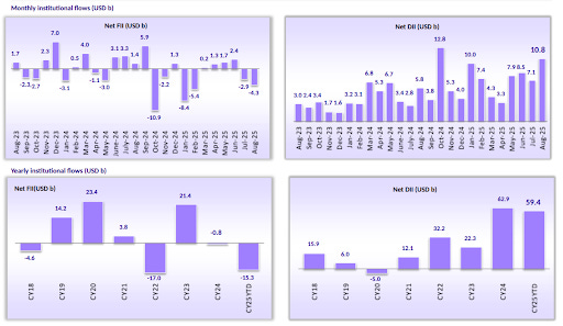 In dollar terms, DIIs have infused a record $83 billion since September 2024—more than offsetting FII outflows of $27 billion. August 2025 alone saw the second-highest monthly DII inflow ever at $10.8 billion, even as FIIs pulled out $4.3 billion.