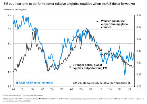 A lot of it comes down to the U.S. dollar. The dollar index has fallen 8% this year, and history shows emerging markets usually shine when the dollar weakens. JP Morgan notes that investors poured $16.3 billion into EM equities in July alone—the biggest monthly inflow in over a year.