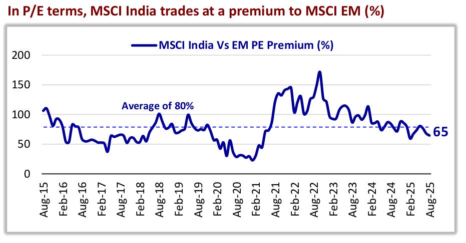 India has long been one of the most expensive markets globally. The MSCI India index trades at a 65% premium to MSCI EM on P/E. When cheaper opportunities opened up in Korea, Taiwan, and Brazil, global investors rotated money there instead.