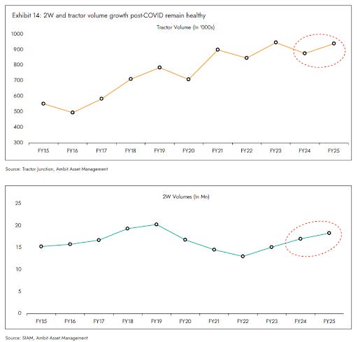The good news is that this downbeat trend might be changing. By FY24 and FY25, volumes have started picking up again. Tractor sales were up 9% year-on-year in June 2025 and 8% in July. Two-wheeler sales also saw mid-single-digit gains. Early signs suggest rural households are beginning to loosen their purse strings again.