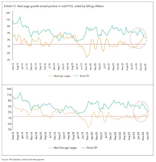 Wages, too, are improving. After years of stagnation, real rural wage growth turned positive in mid-FY25, thanks to lower inflation and more government spending on rural infrastructure. Demand for MGNREGA work has even dipped, which usually signals better job availability elsewhere.