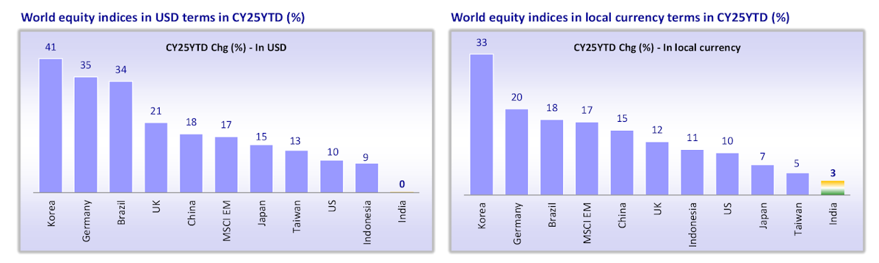 India, on the other hand, has barely managed 3–4% gains this year. That puts it near the bottom of the global leaderboard, as this chart from Motilal Oswal shows.