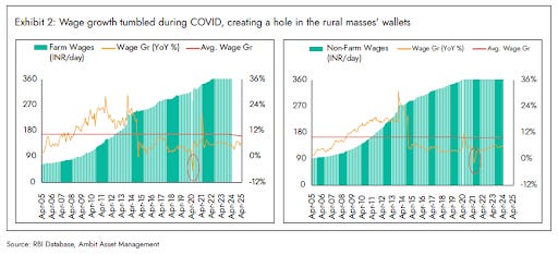 The last few years, though, have been tough for rural India. Ambit Asset Management’s August 2025 newsletter calls the past three years “particularly challenging.” Wages barely moved, prices of essentials shot up, and demand for two-wheelers, soaps, and packaged food weakened. Families cut back to just the basics.