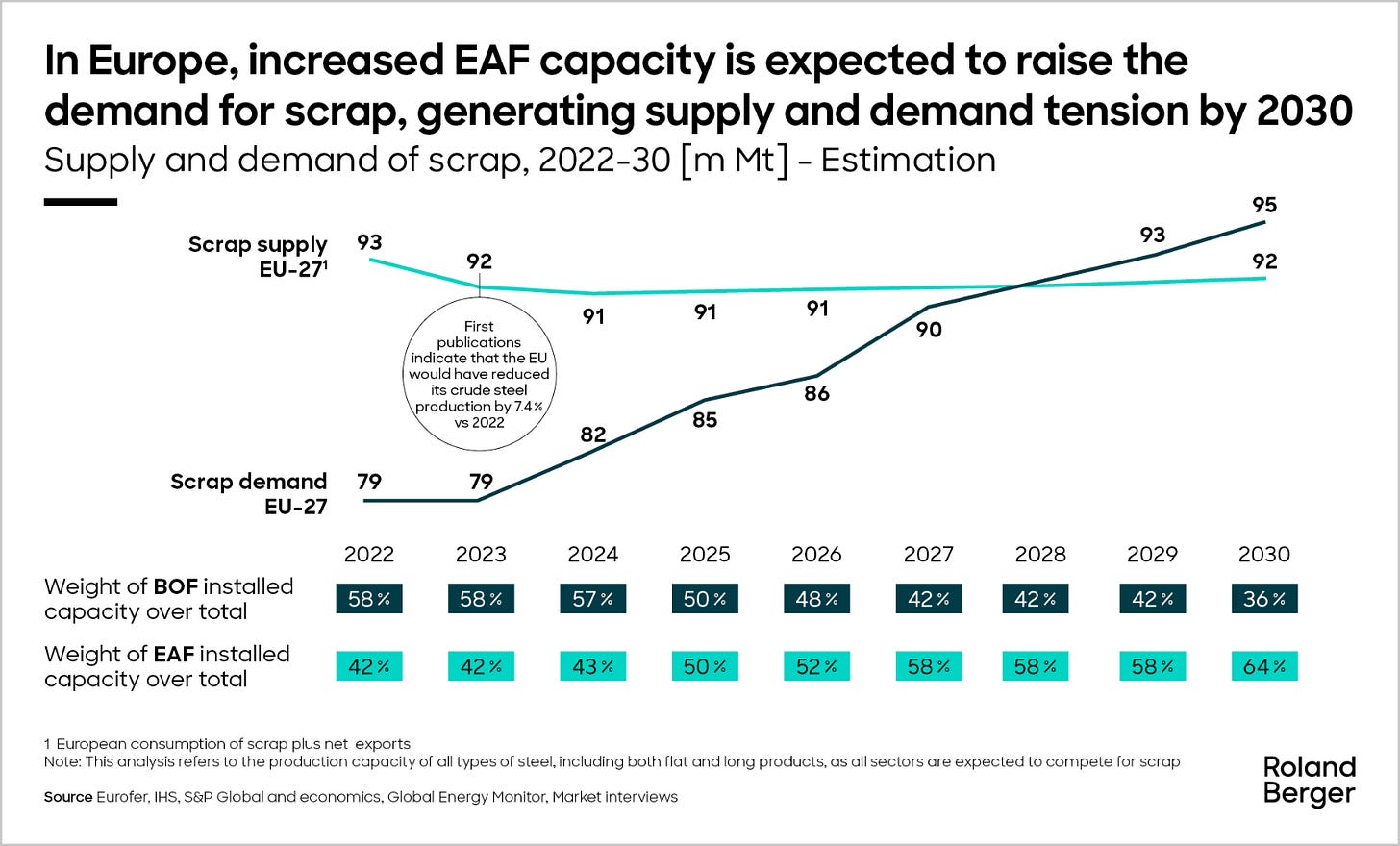 Take steel. Traditional blast furnaces burn coal and emit heavily. Electric Arc Furnaces (EAFs), which largely run on scrap, are far less carbon-intensive. In Europe, EAF’s share of steel production has risen from 30% in 1990 to 45% today. That only works if scrap is available.