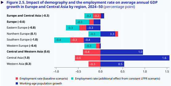 Its challenge isn’t too many young people without good jobs; it’s too few young people, period. These countries are seeing their populations age rapidly, and that is contracting their workforces. The workforces of these economies are contracting at around –0.1% a year — shaving roughly 0.2% per year off their growth rates.