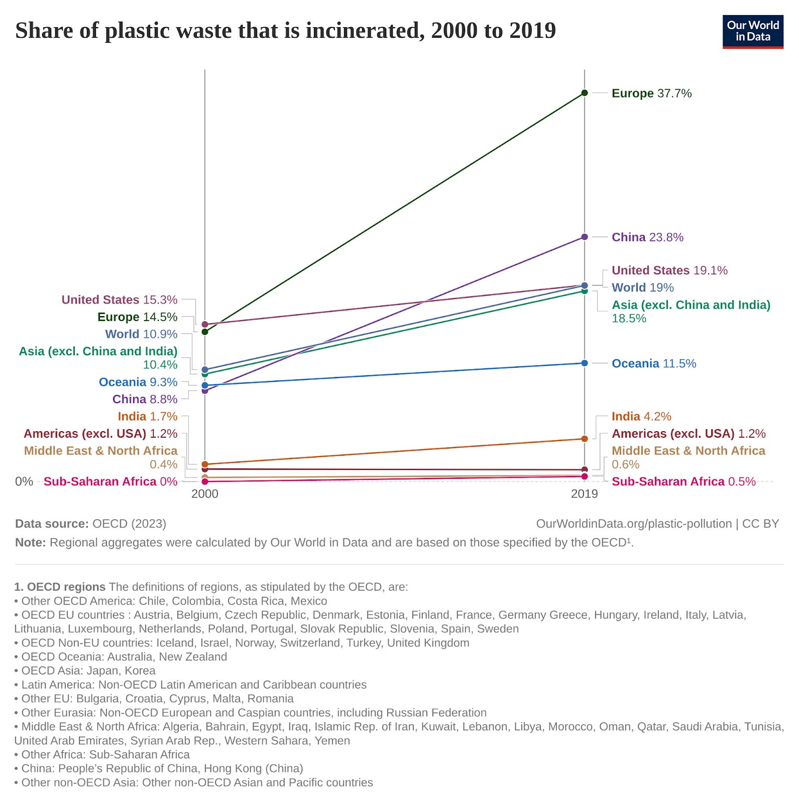 Increasingly, a chunk of the excess waste has gone to “Waste-to-Energy” plants: where trash is burnt — like in poorer parts of the world — but that heat is used to make energy. In European OECD countries, incineration rates rose from 14.5% in 2000 to 37.7% in 2019.