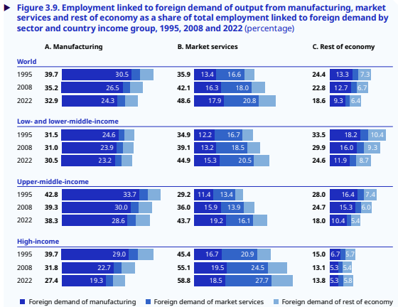 The decline is particularly visible in the world’s richest countries. There, the share of manufacturing jobs that cater to foreign demand has dropped dramatically — from roughly 40% to a little over 27% in the last three decades. In low- and middle-income countries, meanwhile, manufacturing makes up a relatively flat 30% of jobs catered to foreign trade. Manufacturing is still a part of these countries’ development playbooks, but the structural transformation — new people pouring into these jobs every year — has stalled.