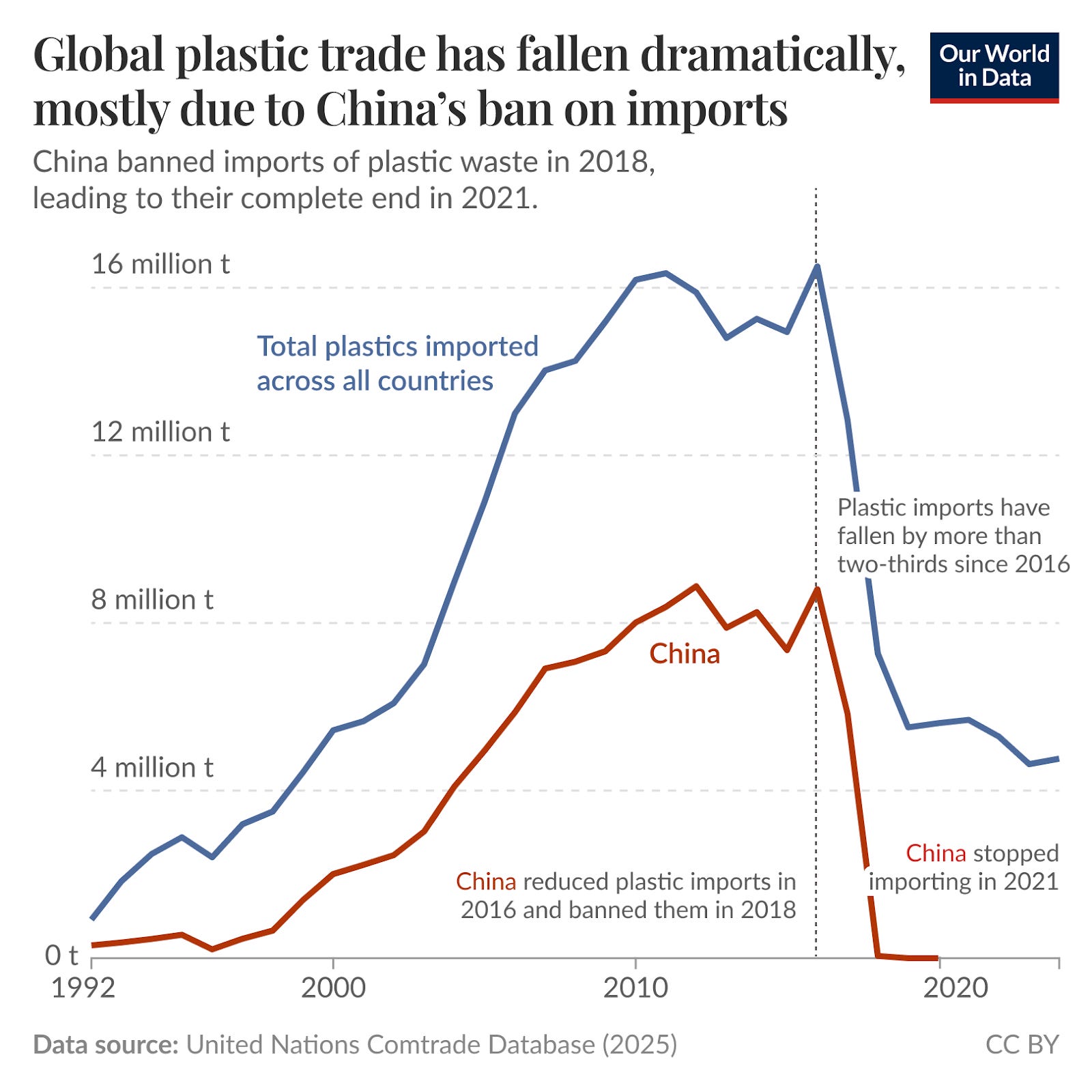 For years, there was a thriving industry that moved literal waste across borders. Then, early this decade, something broke. Our World in Data shows global plastic waste trade falling sharply — from about 12.4 million tonnes in 2014 to 5.8 million tonnes in 2023. That drop caught our attention.