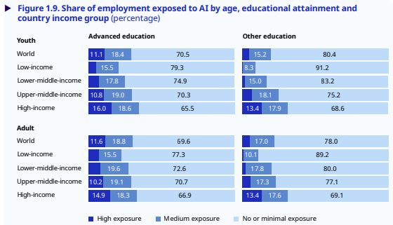 There used to be a traditional career ladder: young people would enter the workforce doing routine cognitive tasks, and would slowly move, from there, to more responsibility. These tasks, however — coding, drafting, data work etc. — is precisely what AI is best suited to replace. AI has, in fact, reversed the traditional advantage that people got from high education. Better educated youth are at a higher risk of displacement than their peers with less education.