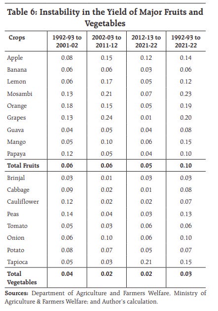 The yields from fruit crops (like mango, grapes, citrus, and litchi) are a lot more volatile and prone to swings compared to vegetables. This is due to weather conditions, pest attacks, and other factors. Some fruits like grapes and sapota actually saw declining yields over certain periods.