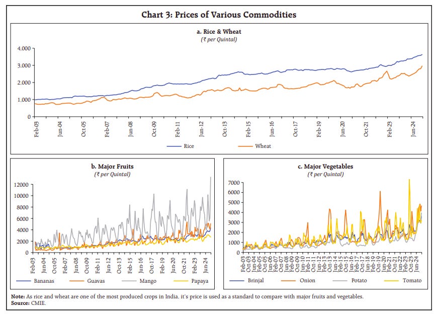 This volatility also reveals why farmers might prefer wheat and rice over horticulture, despite lower-per acre returns compared to horticulture — wheat and rice benefit from guaranteed government procurement at minimum support prices. The study documents how rice and wheat prices have remained relatively stable and shown upward trends, thanks to state procurement.