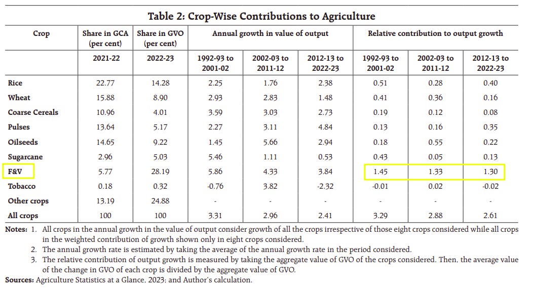 The RBI also looks at the growth contributions of each crop to Indian agriculture, and within that, horticulture stands out. Fruits and vegetables consistently showed the highest growth rates across time, making up 1.30-1.45 percentage points annually. Without this horticultural expansion, India's farm sector growth would have been noticeably slower.