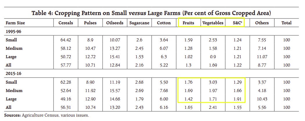 Within these constraints, horticulture offers a pathway forward for small farmers. The crops they are adopting—vegetables, fruits, spices—align well with their resource constraints while offering more output per land. The study finds that small farmers increased their horticultural area share consistently across two decades, from 1995-96 to 2015-16.
