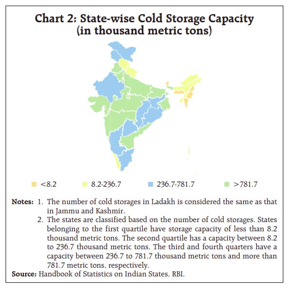 Even the distribution of existing storage facilities is very unbalanced. Four states—Uttar Pradesh, West Bengal, Gujarat, and Punjab—account for 71 percent of our total capacity (nearly 40 million metric tonnes).