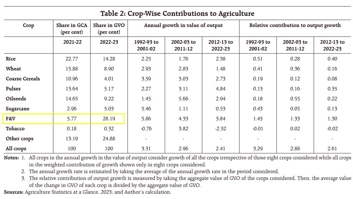 The paper reveals a striking paradox: fruits and vegetables occupy just 5.8% of India's cropland but generate 28.2% of the total farm output value.