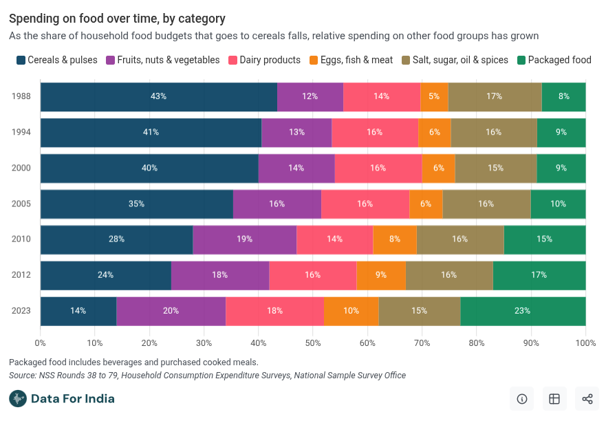 Meanwhile, spending on cereals declined sharply across the same period from 40% in 2000 to 14% in 2023. Indian families were literally voting with their wallets for more diverse diets, and farmers began responding to these market signals.