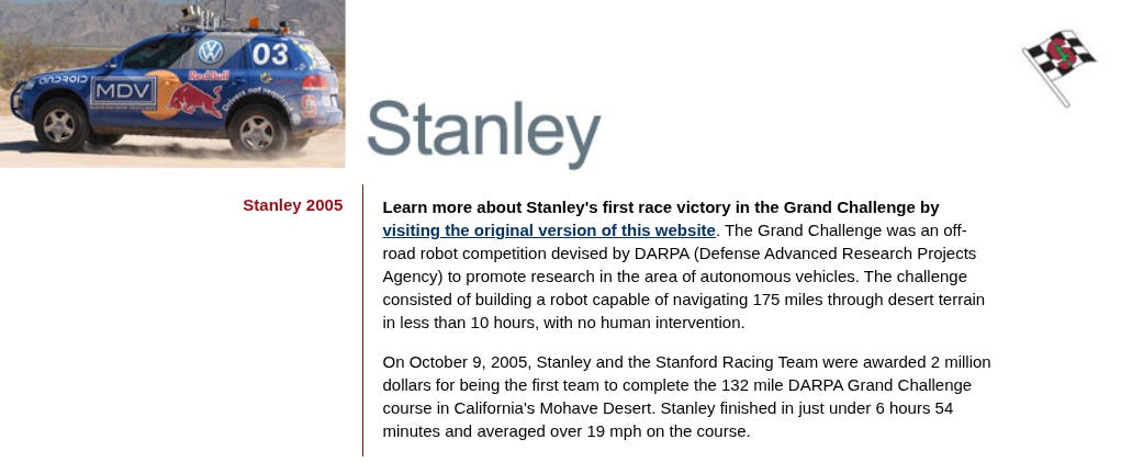 DARPA ran it again in 2005, and this time, a Stanford team’s car called Stanley completed the course.