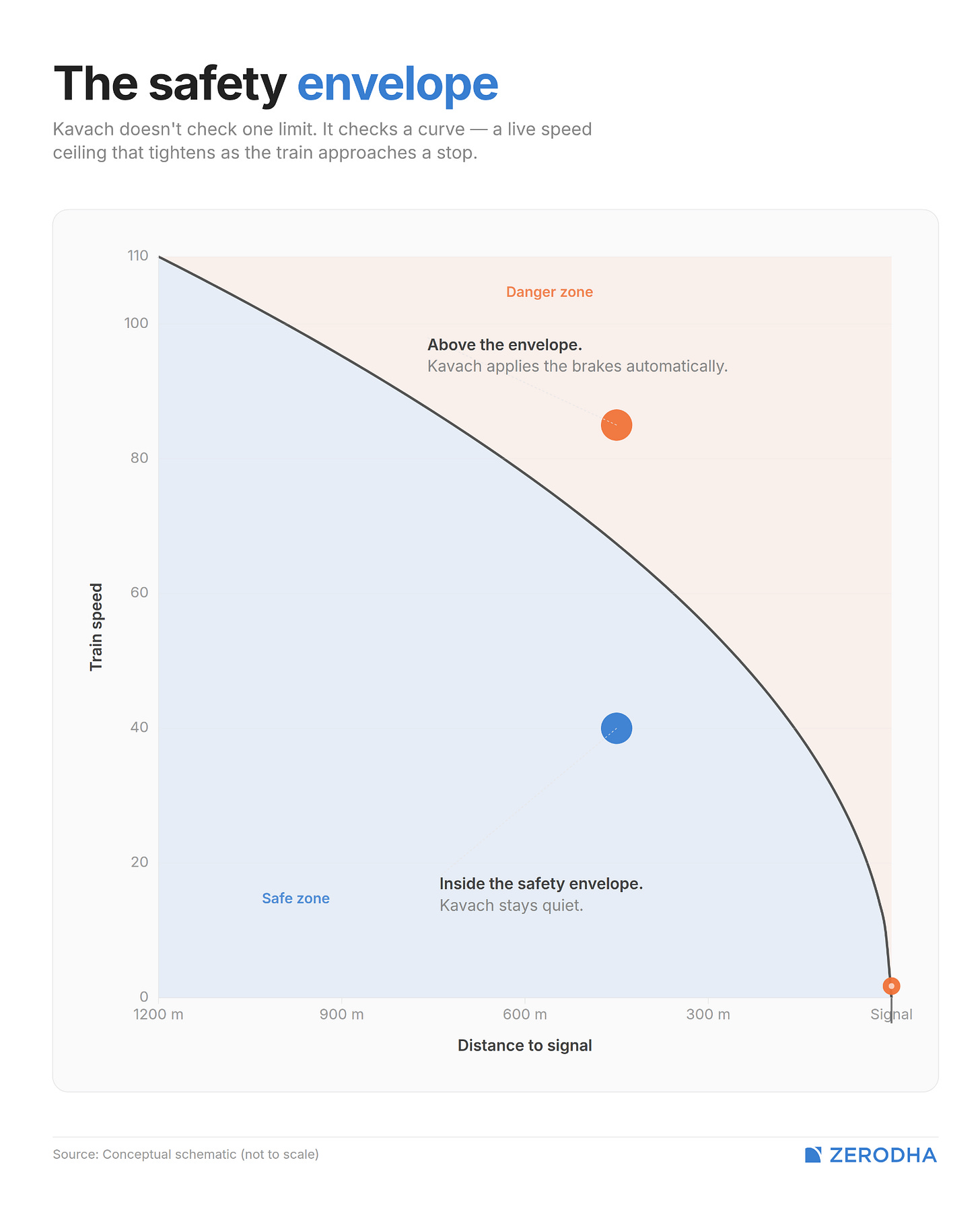 Every train on a Kavach-fitted route runs inside a safety boundary. The system knows where the train is, what signal is ahead, what the speed limit should be, how fast the train is going, and how long it would take to stop. From those inputs, it builds what engineers call a “brake curve“, which maps the speed at which the train needs to be at every point ahead. If the driver goes above that curve, Kavach applies the brakes automatically.