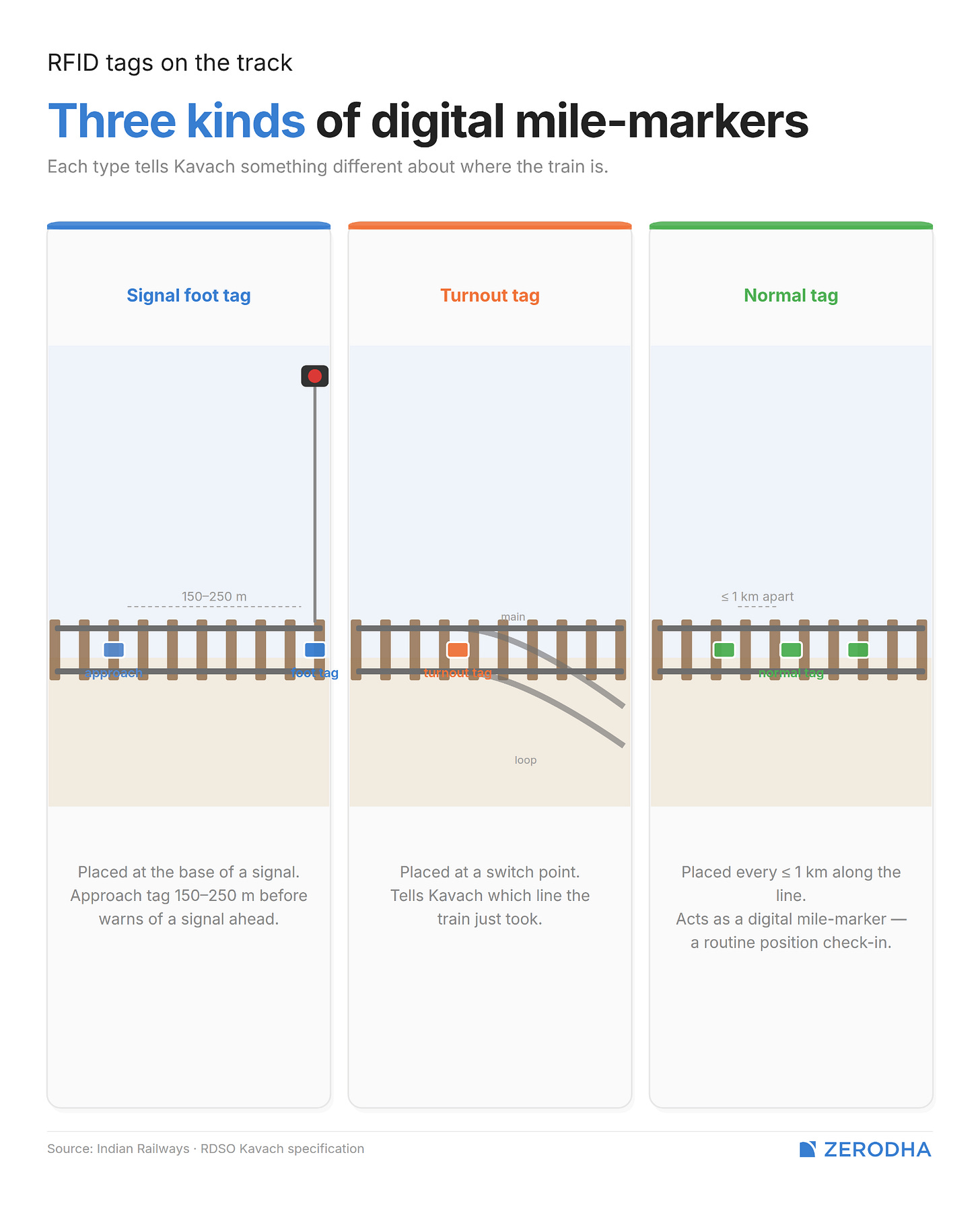 There are three kinds of tags. A “signal foot tag“ sits at the base of a signal, so Kavach knows the moment a train reaches it. A “turnout tag“ sits where tracks branch — at this point, a switch sends a train either onto the main line or off onto a loop. The tag tells Kavach which of the two the train has actually entered. If it’s the main line, speed is capped at 60 km/h, while the loop line is capped at 30.