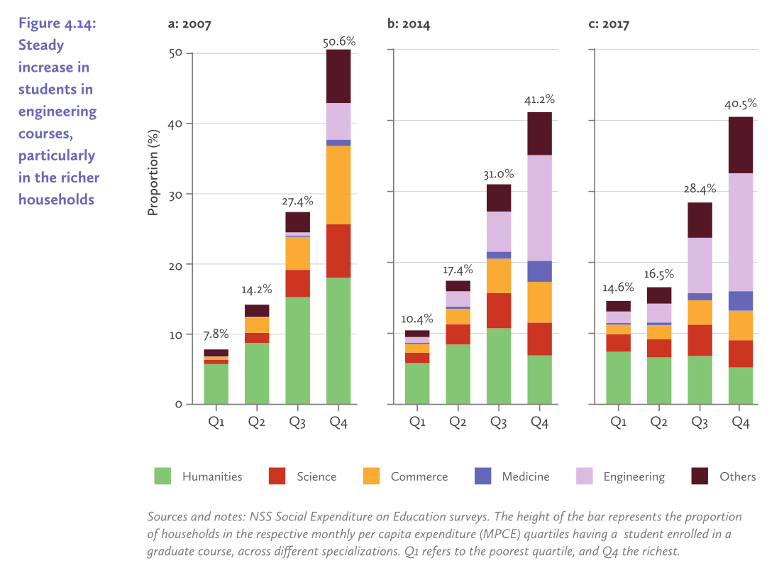 Then, there’s equity. Between 2007-2017, enrollment from the poorest quartile of households doubled — from 8% to about 15%. That sounds like progress, but look at what those families are enrolling in. Youth from richer households are far more likely to be in the professional degrees like engineering and medicine, that lead to stable salaried careers. Poorer households are overwhelmingly funnelled into low-cost humanities and commerce programmes with far weaker employment outcomes. And the gap has only widened over time.