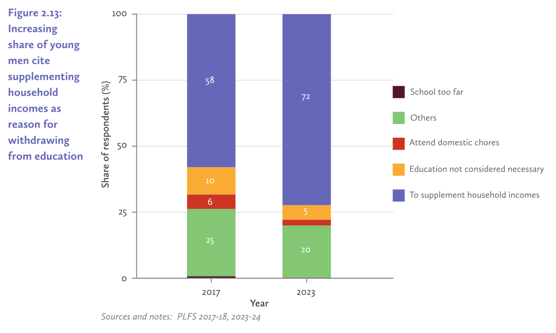 And increasingly, young men are noticing this and choosing to drop out from their degree. Between 2017 and late 2024, male tertiary enrollment actually fell from 38% to 34%. When asked why, 72% cited the need to support household income. In 2017, that ratio was 58%. This is a reversal of a decades-long trend. The economics of a Tier-3 private degree simply no longer makes mathematical sense for them.