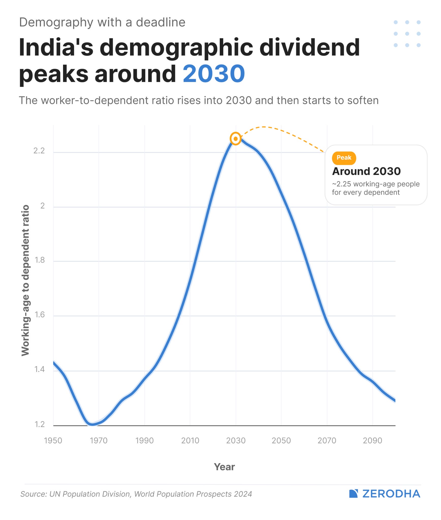 What does that mean for India’s much-celebrated demographic dividend? India has 36.7 crore people between the ages of 15 and 29. This is the largest youth population on the planet, accounting for a third of the country’s working-age population. But the ratio of working-age people to dependents is expected to peak by 2030 and then begin a permanent decline, as the youth share falls and the elderly population grows.