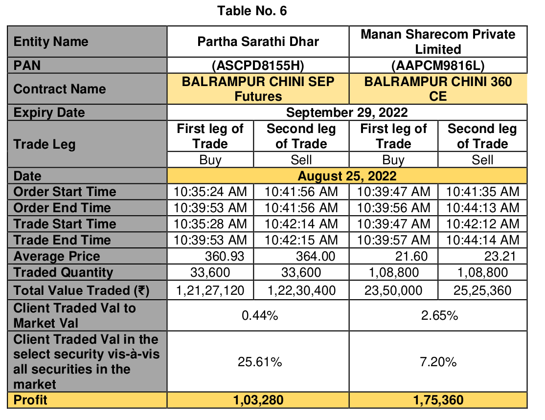 Starting at 10:35 AM, seven minutes before the recommendation would go live, Partha Sarathi Dhar began buying 33,600 Balrampur Chini futures. At the very same time, another of the Profit Makers, Manan Sharecom Private Limited, started buying 1,08,800 Balrampur Chini call options.